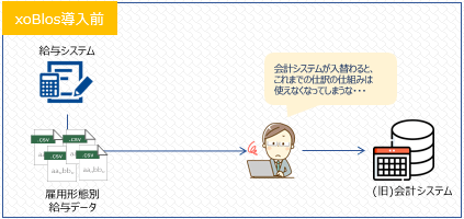 xoBlosの強みである「柔軟なデータ抽出・加工機能」を最大限に活用することで、特殊な形式の給与データも、新会計システムの仕様に沿った仕訳ロジックで実装することができました。