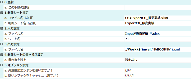2-aにある「Inputフォルダ内にある販売実績_*.xlsx」を読み込んで、データとしてxmlファイルを出力する手順を実行するため、項目1-aにある「制御シート」という、抽出するための具体的な指示を記述したファイルを作ります。