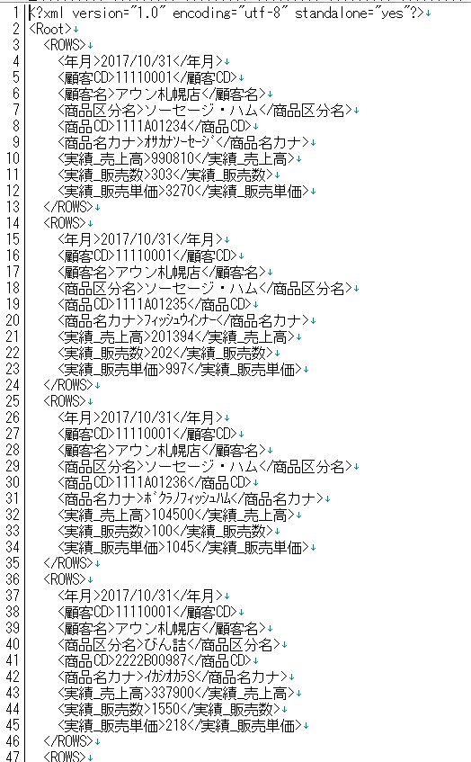 無事抽出が完了し、xmlファイルが出来ました。表にするとExcelと変わりませんが、テキストエディタで開くと、xmlであることが分かります。このデータを並べ替えや加工をして集計などに使用します。