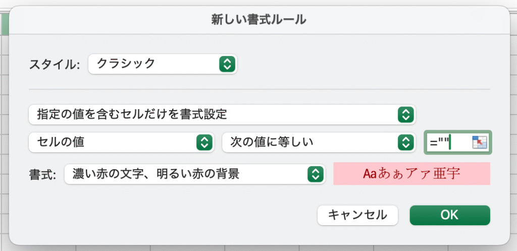【新しい書式ルール】にて、値を指定する欄に「=””」と入力し、OKをクリック