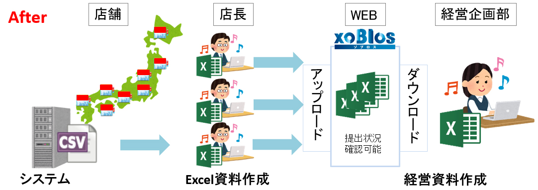 売上集計での例をあげると、各店舗のPOSシステムから出力したデータをそのまま取り込み、xoBlos上で実行するだけで、希望のフォーマットに整った集計結果を出力するといったことが可能になります。