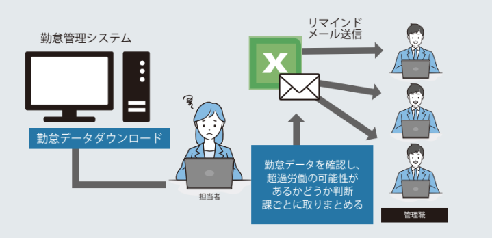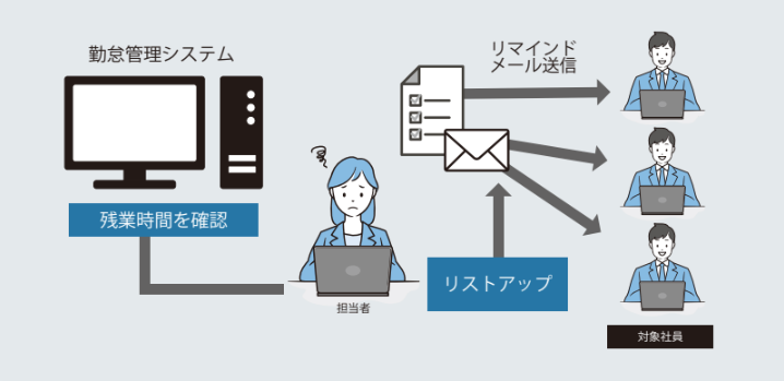 - 担当者が勤怠システムで各社員の残業時間を確認