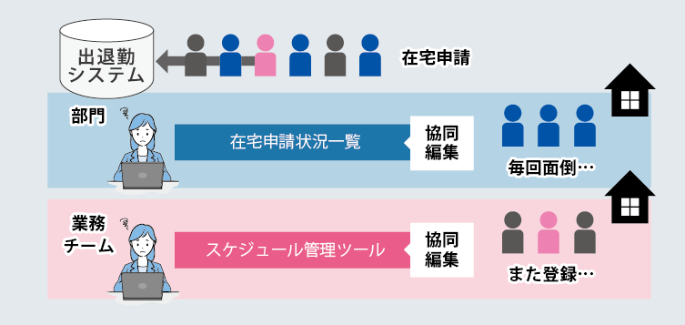 - 在宅申請状況を把握するため一覧表の共同編集が必要で、把握と管理に手間がかかる