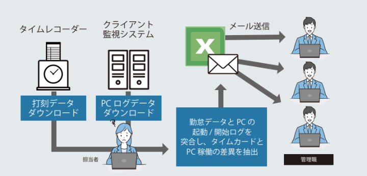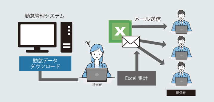 - 勤務時間を手作業で集計し、まとめたExcel®ファイルを関係者にメールで送付
