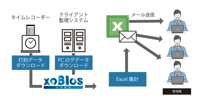 - xoBlosで打刻データとPCログデータを突合し労働時間差異を自動で抽出
