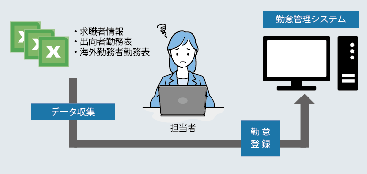 - 対象者の勤怠情報をExcel®を収集・参照しながら、勤怠管理システムへ手入力