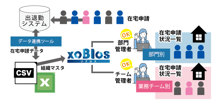 - 今まで通り出退勤システムに在宅申請・承認を行うだけで、申請状況一覧へ自動反映