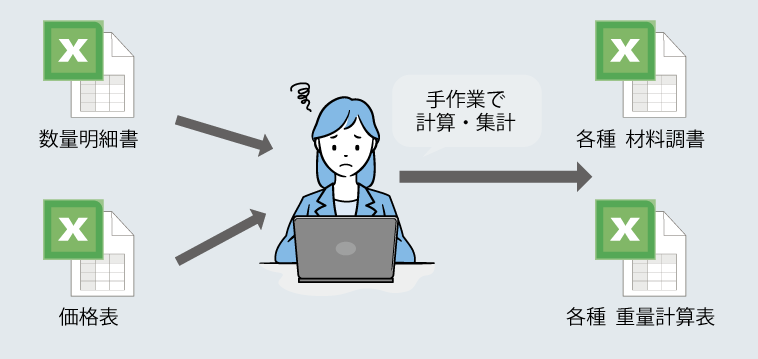複数のデータソースを照合・集計し、正確な数量や金額を算出する必要があるため、Excel®を用いた複雑な作業が発生します。