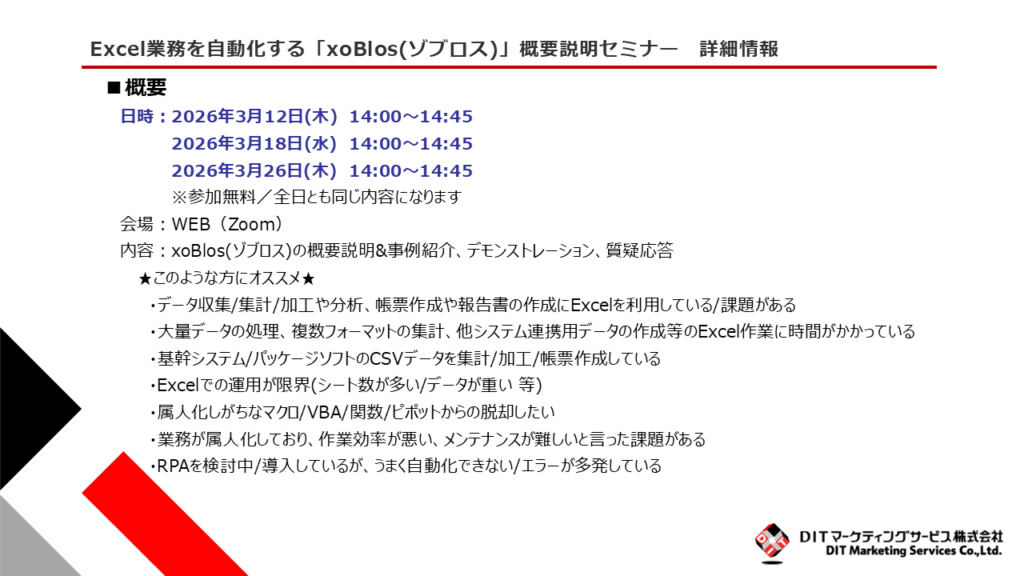 セミナー 2026.03.03 NewExcel業務を自動化する「xoBlos(ゾブロス)」概要説明セミナーを開催致します。①2026/3/12(木) 14:00~14:45 ②2026/3/18(水) 14:00~14:45 ③2026/3/26(木) 14:00~14:45※各回ともに同じ内容になりますお申し込みはこちら※申込締切:各回ともに当日のPM12:00※お問い合わせ項目:セミナー をお選びください※お問い合わせ内容:○○セミナー と日付をご記載ください(例:3/12セミナー)